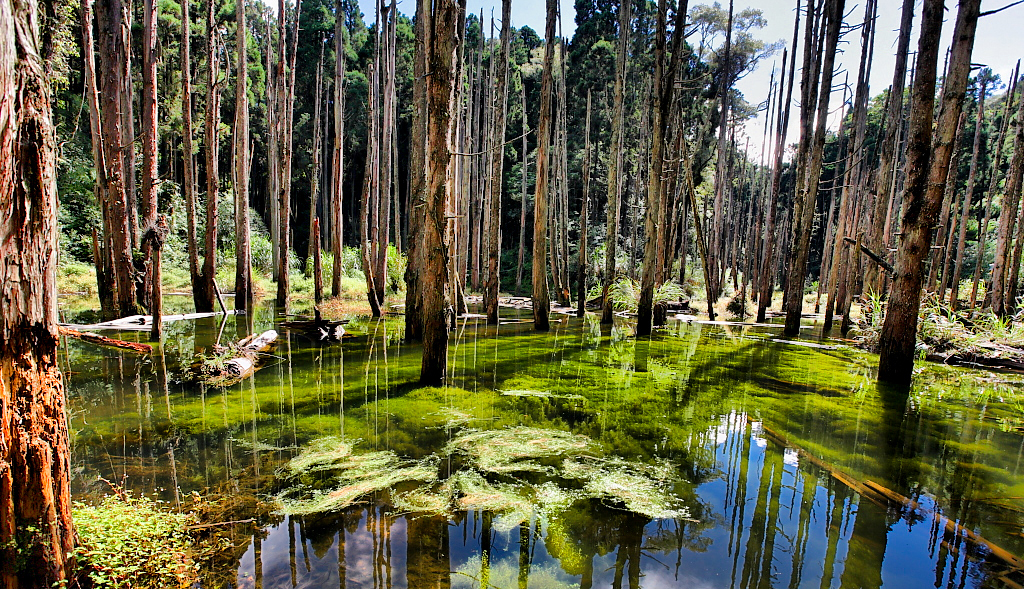 下車後徒步一小段山路縱深,才到這枯木參天秘境。說起來這也有一段悲傷往事,它是1999年921大地震後才形成的景點,因河道阻塞而形成沼澤湖,杉木枯死,筆直朽腐的杉木群也因長期泡水,湖下苔藻繁衍,形成特殊的景致。