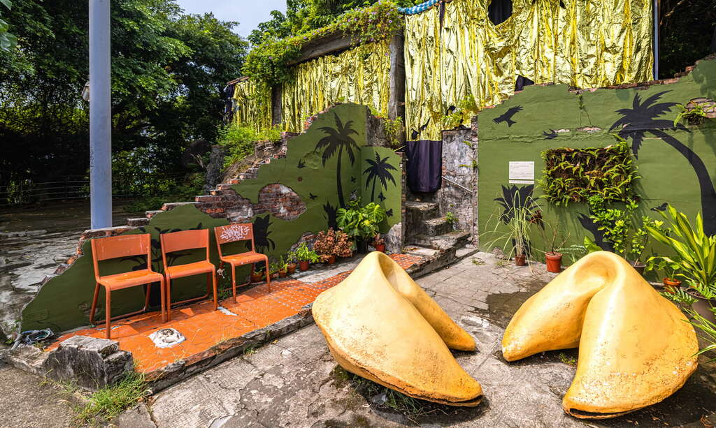 沿著羊腸九曲的石階登山,先來到藝術村的無人接待中心「三角窗」,旅客可在此索取各展場的活動資訊單張,還有紀念蓋章。整個寶藏巖共有14間藝術家工作室,部分藝術家會在假日開放予旅客入內參觀,但平日白天大多重門深鎖。幸好村內隨處可見藝術家們的塗鴉粉飾,甚或是藝術雕刻與裝置,藝術的氛圍加上老村的生活感,到處都是拍照的好題材。另有6個戶外展場散布村內各處,其中位置最高的一個展場,由一排倒塌的房舍改建,就在一片頹垣敗瓦中央,置了兩顆巨型的「幸運曲奇」,對比強烈!