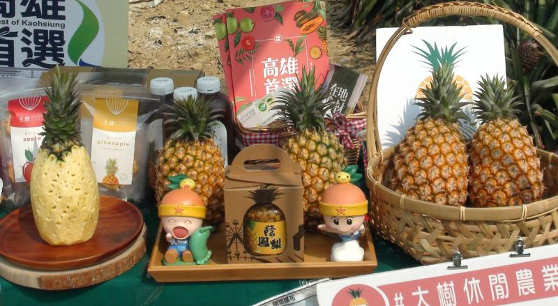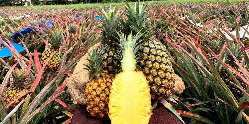 高雄市大樹區這片種鳳梨的土地有1,600多公頃,放眼是矮矮的、粗壯的尖長葉子,呈淡綠和淡棗紅色。鳳梨則穿上紙T-shirt,外形趣致,有些更包了報紙。導賞員說,鳳梨結果要一年,是先果後花,「12個月大的鳳梨怕曬又怕凍,所以要戴帽子或穿衣服。不可以凍傷,否則外皮有瘡疤。」鳳梨是年生的沒季節性,10月至2月味酸甜,4月至9月變甜。「到18個月,鳳梨就成熟可收成。兩公斤多、呈金黃色、三年期的鳳梨,最美味。」採鳳梨也要技巧,葉邊有鋸齒,鳳梨表面有「菠蘿釘」,要戴勞工手套,雙手拿著鳳梨,不停左轉右擰,聽到「啪」一聲就成功了。「鳳梨頭部較甜,採後存放兩天,可讓頭部糖份走向底部,令整個鳳梨變甜。」