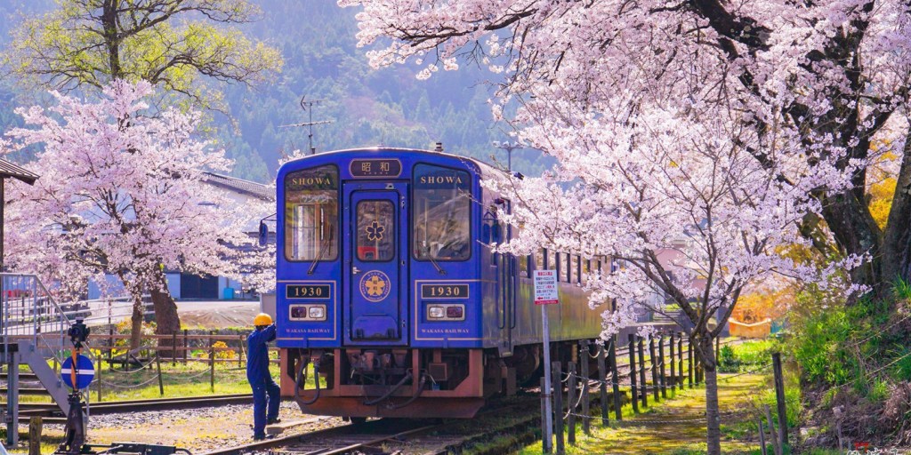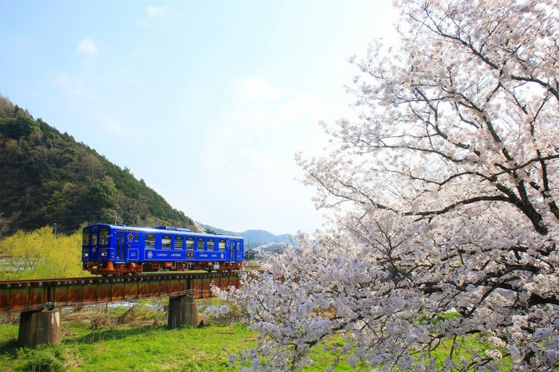 換好和服就可以正式出發,由JR鳥取車站乘搭觀光列車前往若櫻。分為3款不同觀光列車,包括「昭和號」、「八頭號」及「若櫻號」,每架列車都有其特色。今次乘搭的「昭和號」於2018年3月開始投入服務,車身為藍色,單看火車外型已經充滿著昭和風情。車廂內則以鵝黃色為主調,再配上碎花梳化,復古感十足。除了普通長椅外,更有面對面坐的「卡位」,非常特別。若櫻線總長19.2公里,距離鳥取約一小時車程。大家於車程途中已經可以見到滿滿的櫻花,非常賞心悅目。
