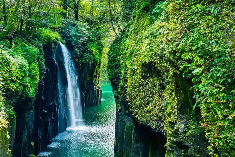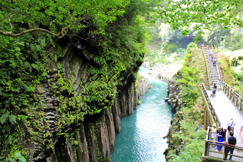 峽谷總長約7公里,在兩旁的斷崖上仍清晰可見昔日火山爆發的痕迹。而在峽谷之間,還有一處著名景點,就是真名井瀑布。它更被選為日本百大瀑布之一,從17米的斷崖高處傾瀉而下,伴隨旁邊的青幽綠樹,視覺效果上的確非常震撼。
