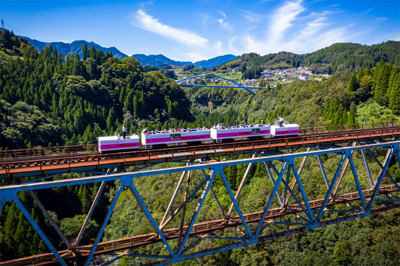 高千穗峽位於宮崎縣北面,距離市中心約140公里,即使自駕或乘車前往動輒也要兩、三小時,所以如想遊覽高千穗峽的話,建議來個兩日一夜小旅行會比較划算。除了重點節目於高千穗峽體驗划船外,必玩的還有乘坐高千穗「小火車」天照鐵路,在高空105米感受當地自然風光。鐵道行程最特別之處是沿途會經過高105米的高千穗橋,更是1972年當時日本最高的鐵橋。坐在小火車上,從逾百米高的橋上往下看,那種「大地在腳下」的感覺亦刺激震撼。