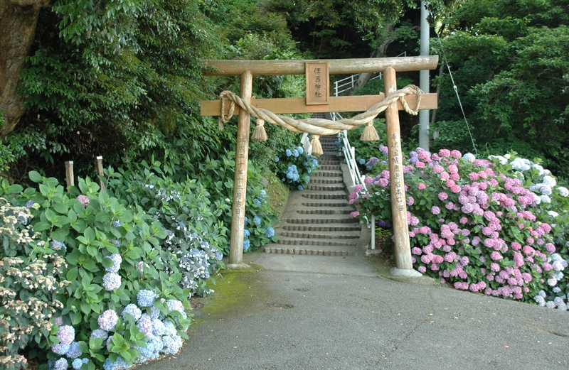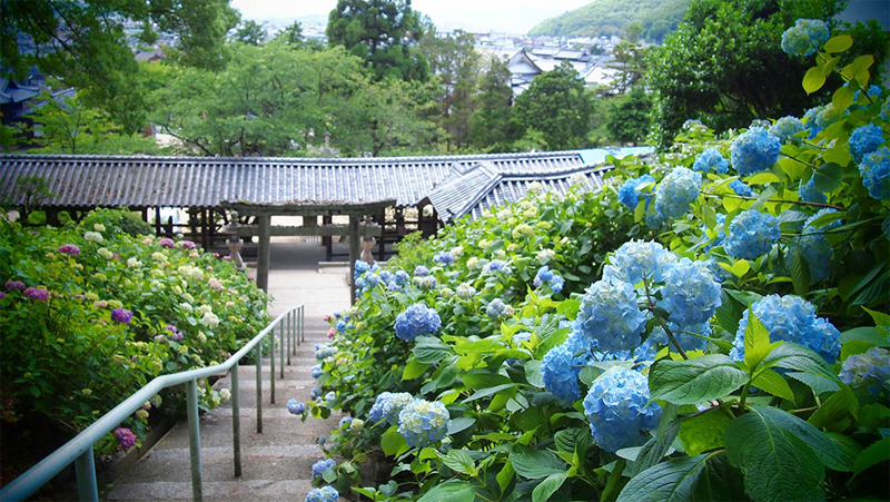 相傳是桃太郎傳說原型的神社,沿著 360 米長的大迴廊兩旁種了 1,500 株繡球花。