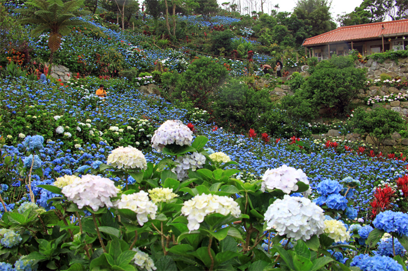 從 2 株開始種植的繡球花故事,園主花了 30 年心血,現在園內佈滿約 40 種 1 萬株繡球花,展現壯觀的優美景色。