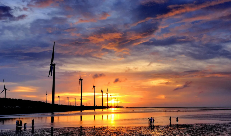 雲林莞草下的泥沼,有一個個的小洞,正是弧邊管招潮蟹出沒和棲息之處。碩大的紅色螯足的是雄性,相當好認,看看牠們緩緩一動一靜地爬行,傍晚時更空群而出,細觀下相當療癒。 木棧道全長約690呎,遊客可於盡處走下泥灘,摸蜆之餘亦可等待落日,約5時半天色催黯,潮汐漸至,形成平緩的天空之鏡,亦是絕佳的打卡時分。到了6時多「鹹蛋黃」艷陽徐徐落下,映照層層燃灼的金光,以為這是戲肉?未算,走到風車大道上,風車陣呈斜角排開,暈染陣陣淡紫的彩霞,才是真正的magic moment,看一次畢生難忘。