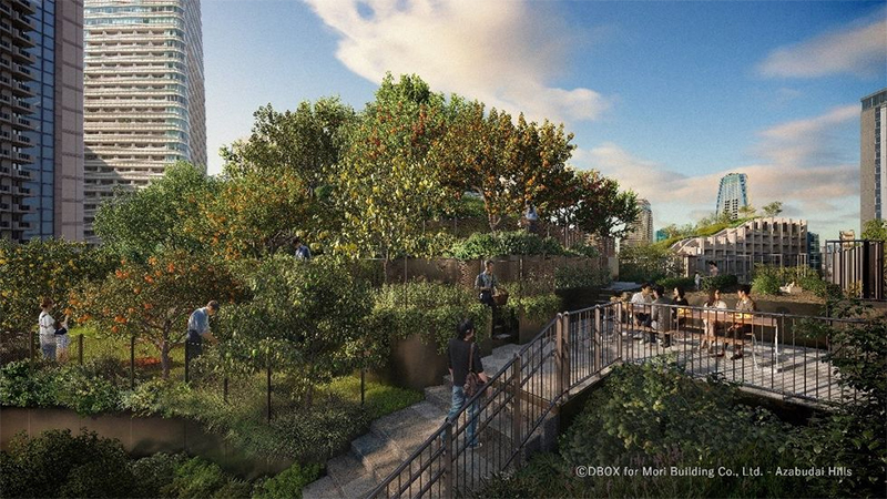 麻布台之丘整片建築的全域綠化達2萬4,000平方米,其中約有6,000平方米的中央廣場充滿綠意,步行其中猶如身處大自然內。中央廣場更是開闢菜園果園,栽種藍莓檸檬桃子等果樹,共種植著約320種植物。而各種樹木的種植也賦以巧思的規劃,像是2月春季臨近時,就能陸續看到不同品種的櫻花依時序盛開,讓花季能延展至5月。