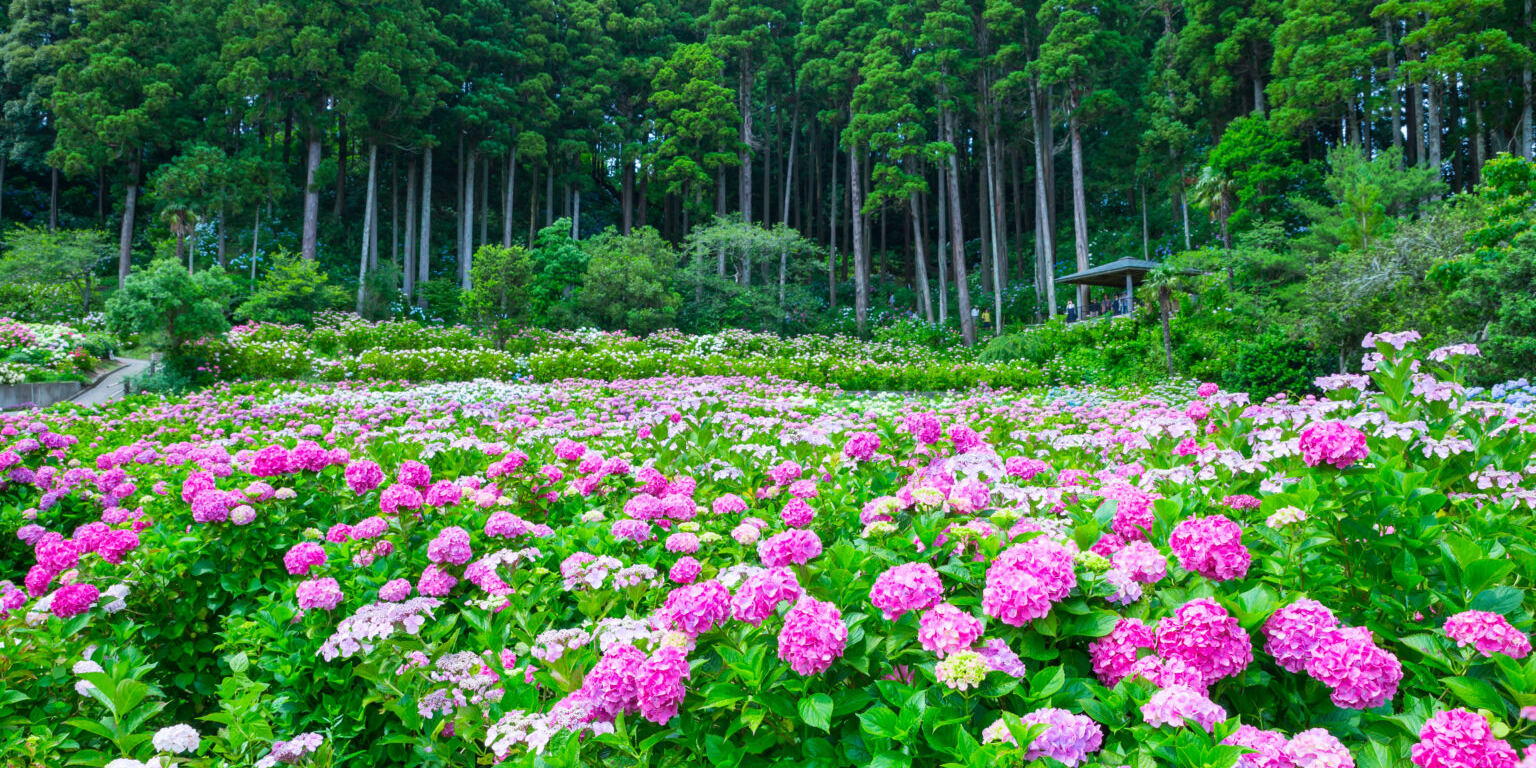 由6月上旬至7月上旬,千葉縣的服部農園繡球花屋敷園內有超過250種、1萬株以上的繡球花,從山上綻放到山下,形成一片壯觀的彩色斜坡。如詩如畫的美景,是欣賞繡球花的最佳景點。